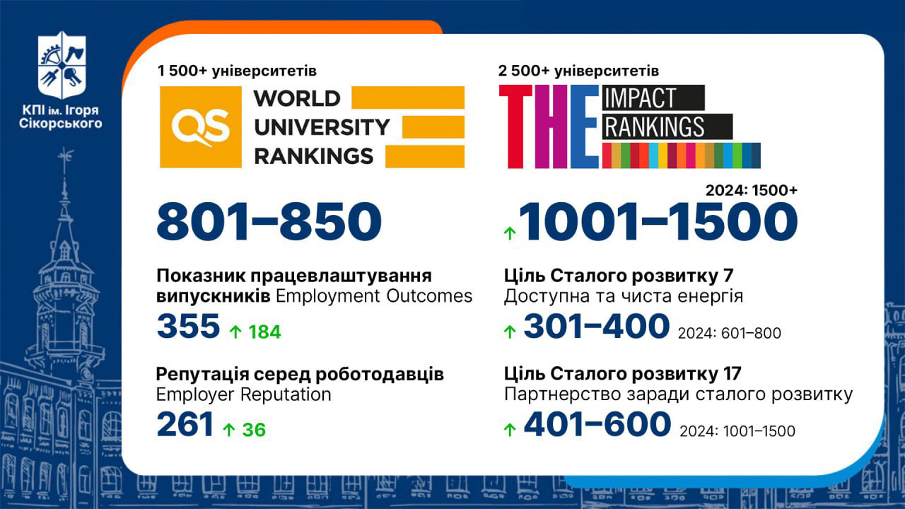 • the greatest progress in Goal 17 “Partnerships for sustainable development”: 401–600 (last year 1001–1500), which indicates the development of international cooperation, cross-sectoral initiatives, and the integration of sustainability principles into the university's management processes;