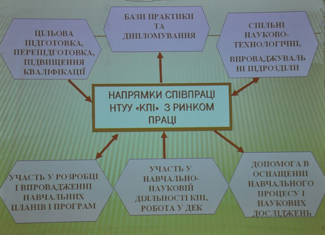 Відкриваючи зустріч, перший проректор НТУУ «КПІ» академік НАН України Юрій Якименко зауважив, що вона є першою з запланованої на цей місяць низки заходів, спрямованих на вирішення проблем працевлаштування випускників університету. І хоча нині з університетом співпрацюють понад 4000 компаній, підприємств, фірм і організацій, і практично всі випускники КПІ одразу після закінчення влаштовуються на роботу, це не дозволяє адміністрації університету випускати ці питання з поля зору. Особливо, якщо зважити на те, що до старих партнерів КПІ щороку долучаються нові. А в НТУУ «КПІ», в свою чергу, з’являються нові, запитані ринком спеціальності, без яких стає неможливим подальший розвиток не лише окремих підприємств, але й усієї економіки країни.