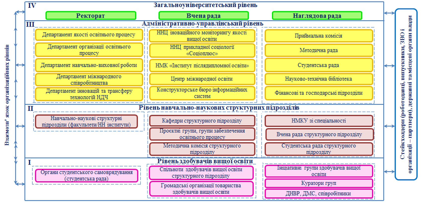 - Четвертий рівень – Ректорат, Вчена рада, Наглядова рада.