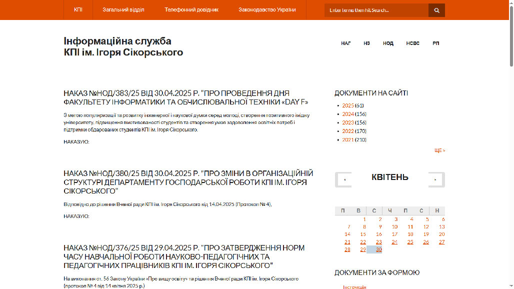Накази та розпорядження Національного технічного університету України «Київський політехнічний інститут імені Ігоря Сікорського» публікуються на спеціалізованому ресурсі. https://document.kpi.ua Нормативні документи ДУС Сайти адміністративних підрозділів
